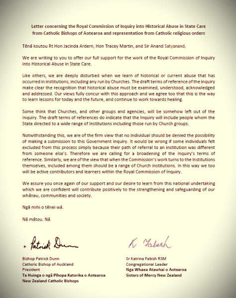 The letter, signed by Bishop Patrick Dunn, President of the New Zealand Catholic Bishops Conference and Sister Katrina Fabish RSM, Congregational Leader of the Sisters of Mercy, offers full support for the work of the Royal Commission of Inquiry into Historical Abuse in State Care and seeks a broadening of the Inquiry’s terms of reference to include a range of Church institutions.